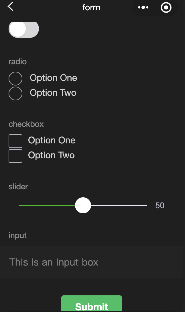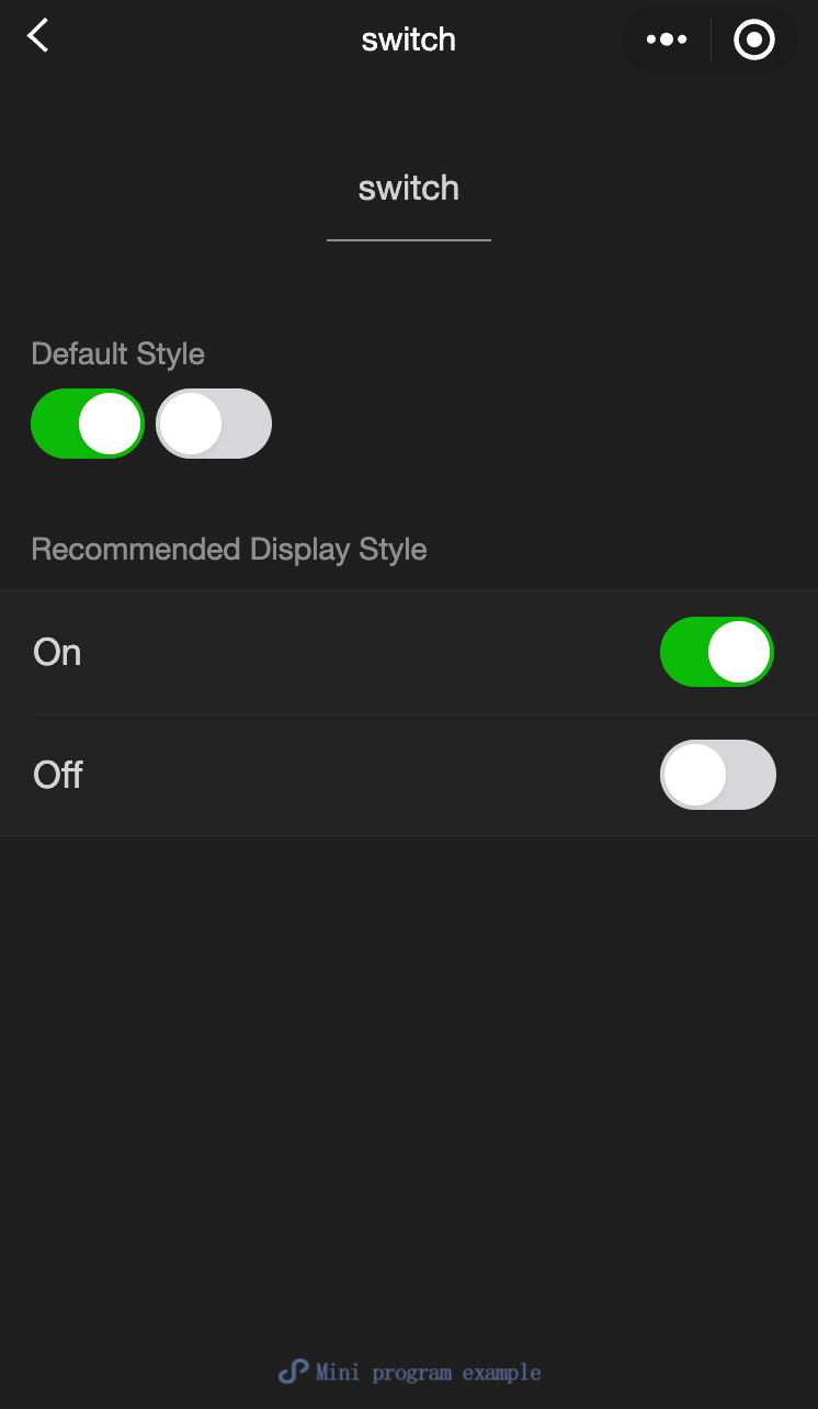 <switch checked="{{switch1Checked}}" bindchange="switch1Change" />