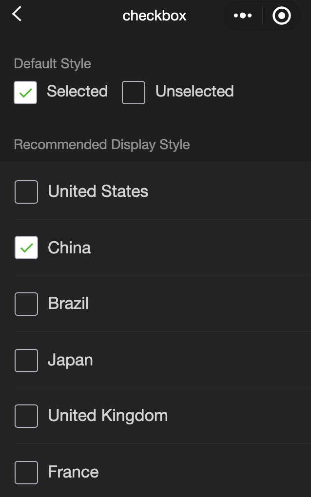 | type | string | switch | No | Style, valid values: switch, checkbox |