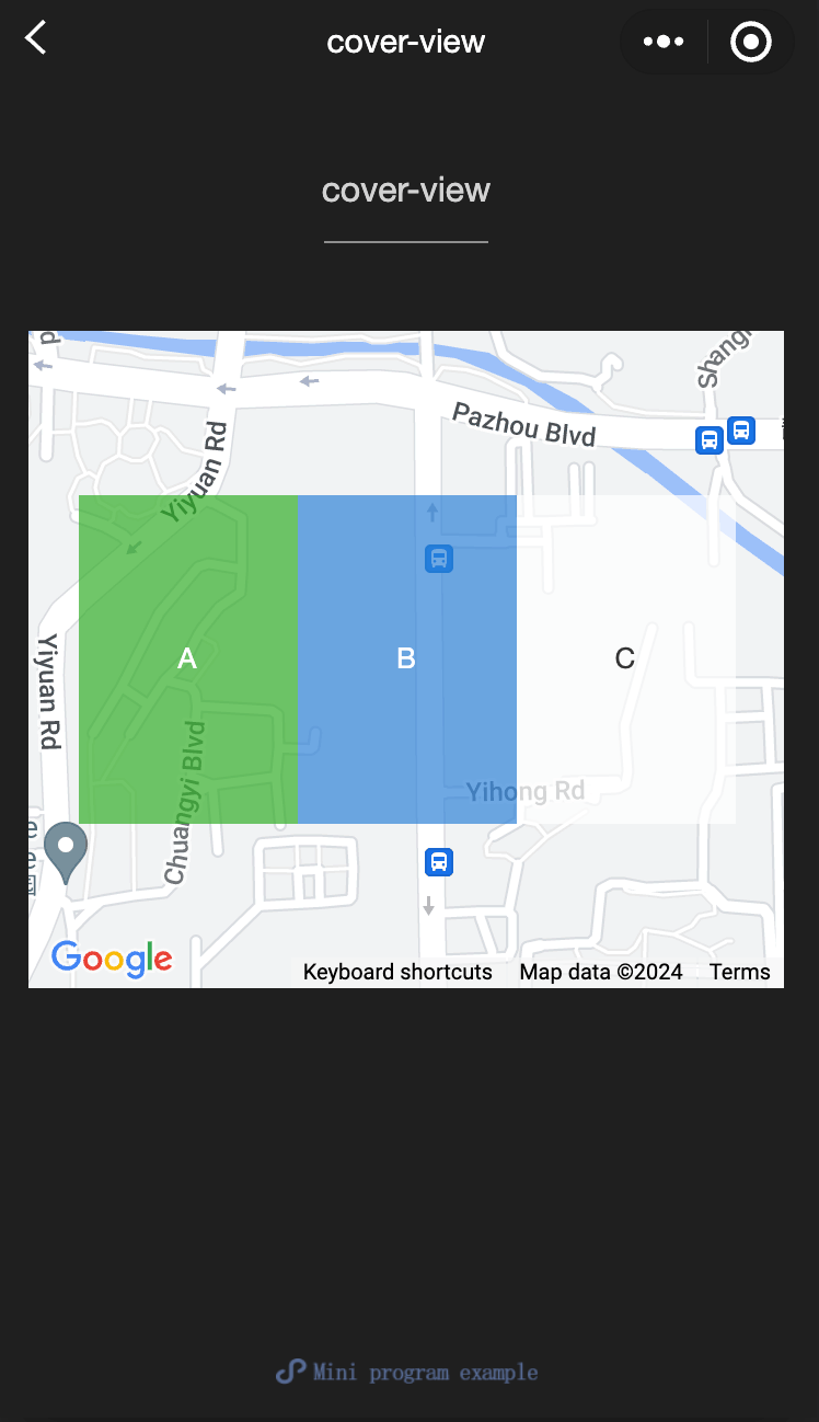 Function Description The text view overlaid on the native component, the native components that can be overlaid include map、video、canvas、camera、live-player、live-pusher,, only supports nestingcover-view、cover-image, can be cover-viewUse inbutton
