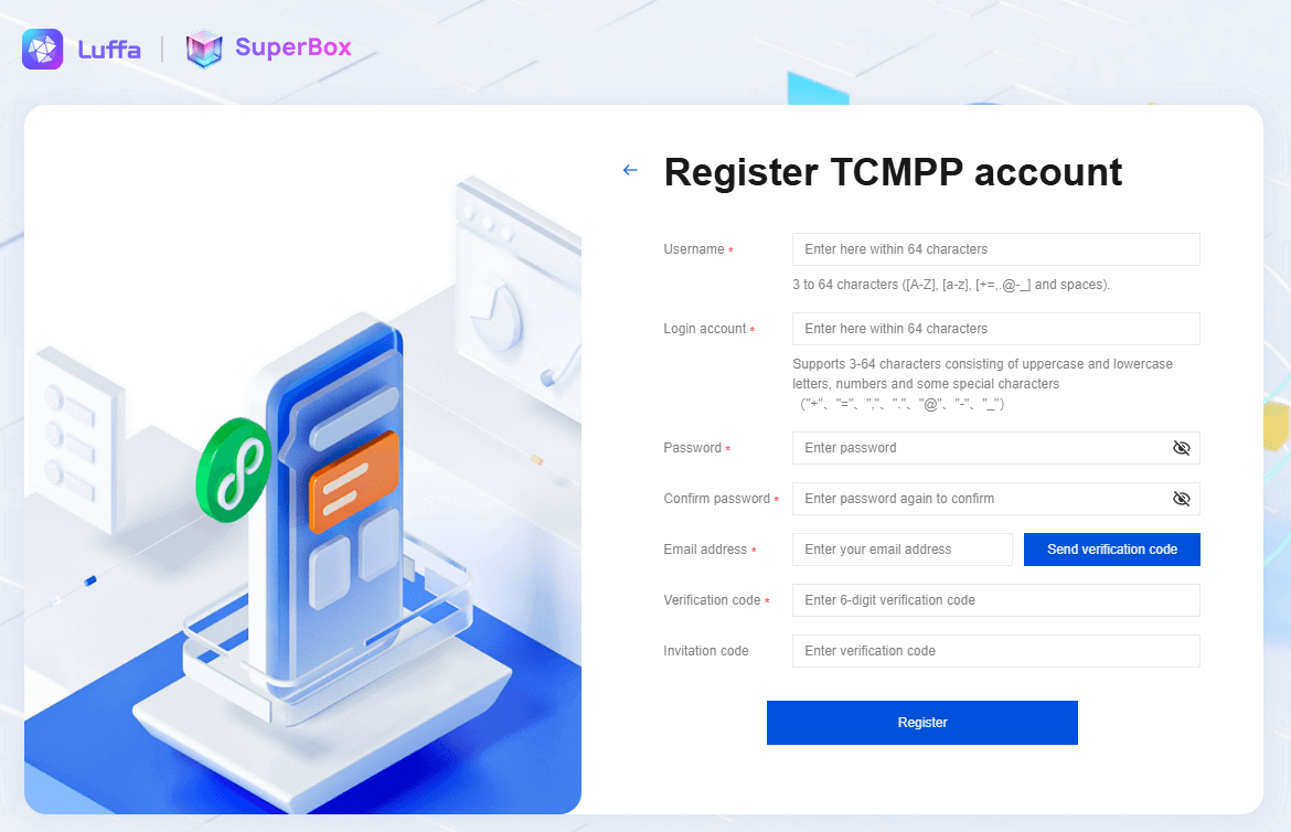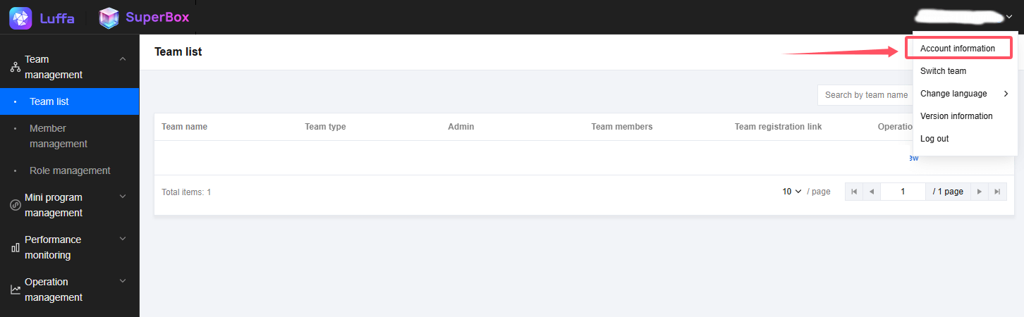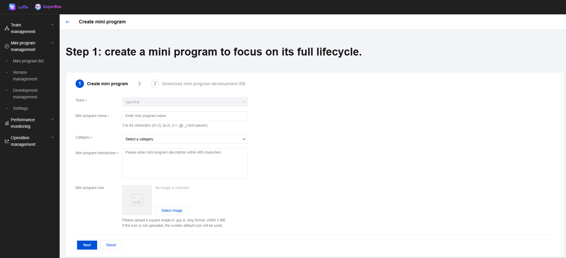 1.After logging in with the created account, the mini program team administrator can click Create Mini Program on the mini program home page, and configure the mini program related information on the create mini program page.