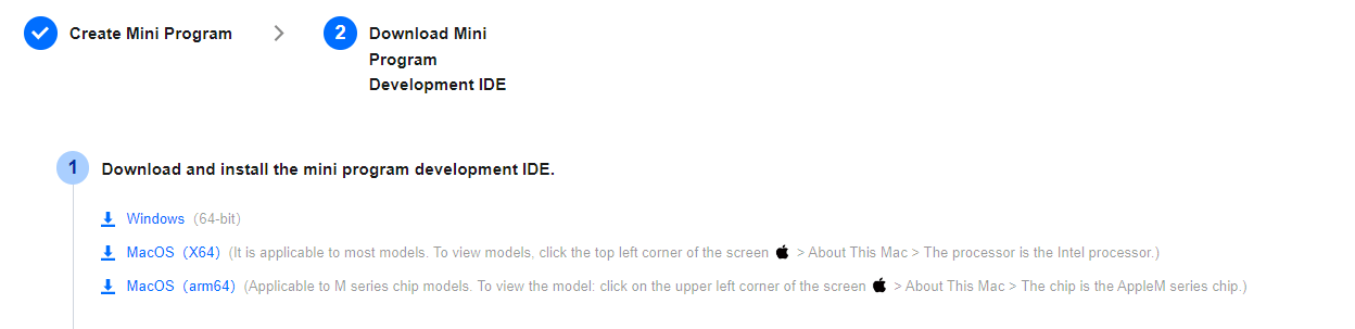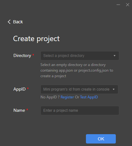 1.After completing the three steps of connecting the application, creating the applet, and binding the applet to the application, the developer can create a new project in the IDE (note that the AppID here is the applet id, and you can pull down to select the one that has been created in the console Mini program, no manual input required).